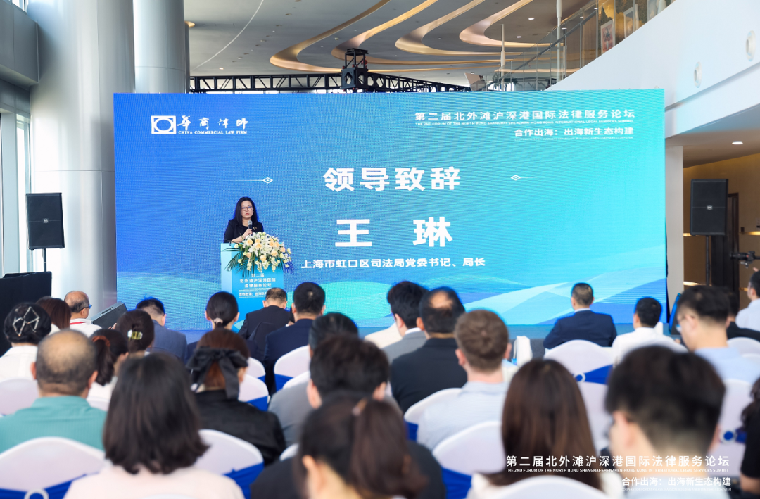 上海市虹口区司法局党委书记、局长王琳致辞表示,依托北外滩国际法律服务港,虹口正全力打造北外滩企业出海服务中心,通过整合跨境法律服务资源,将为出海企业提供专而精、点对点、一站式的出海服务。